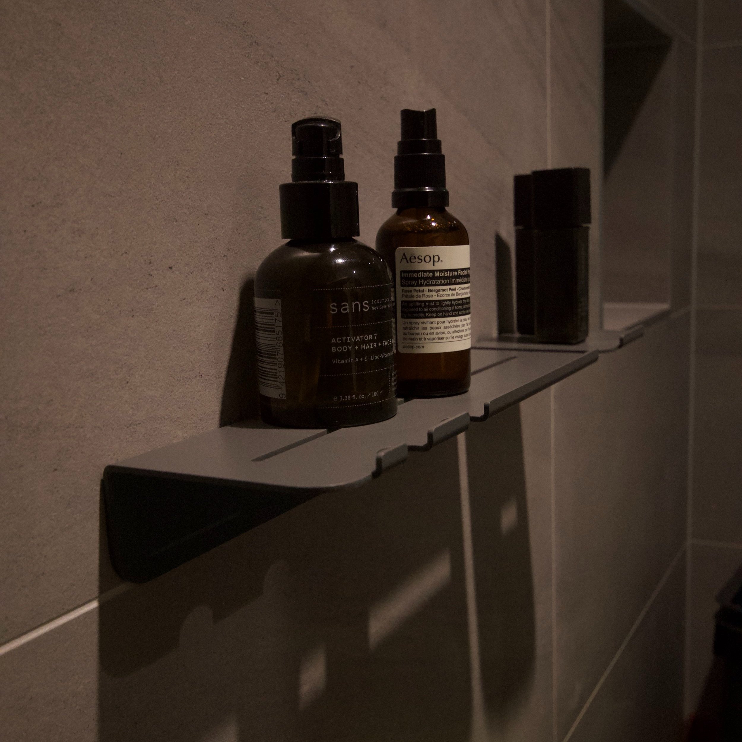 The folded 2mm powder-coated aluminium shower shelving unit allows for no rust or corrosion, while harmoniously balancing a crisp yet robust design.