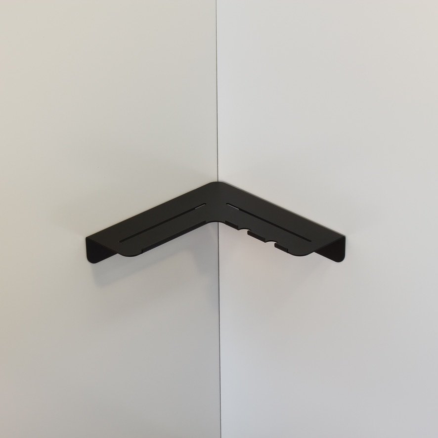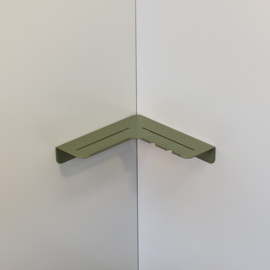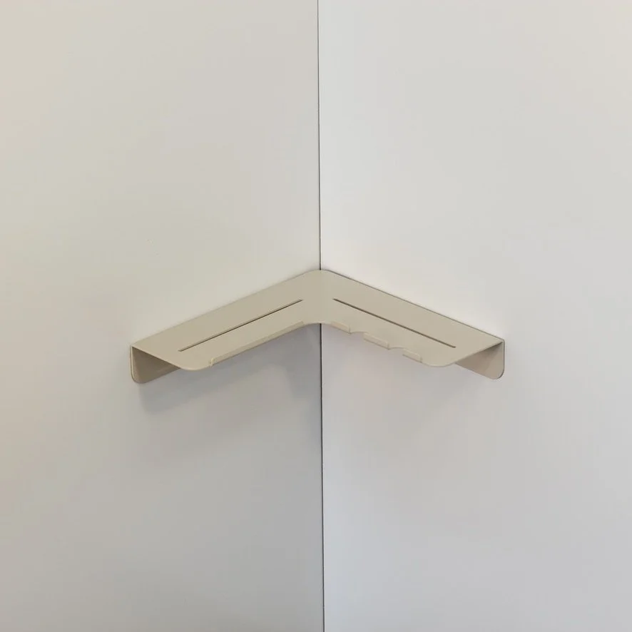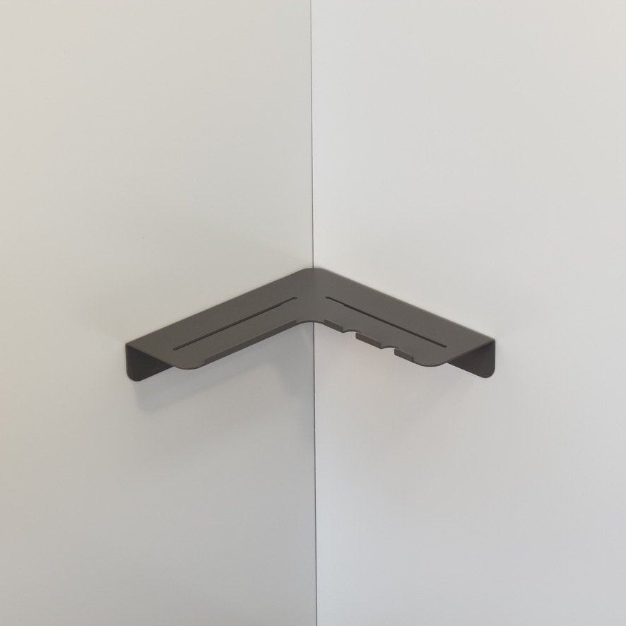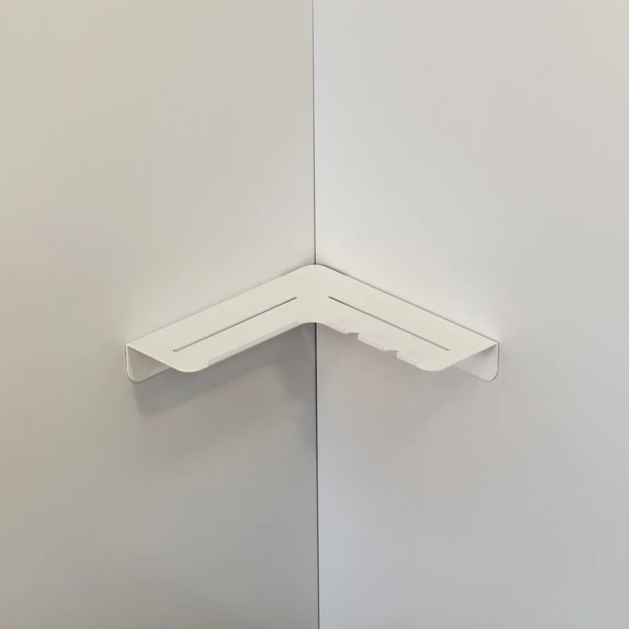 Vito, a minimal folded metal corner shower shelf designed to sit out of the way while still allowing a decent shelf depth. Vito expresses its functionality through its relief pattern drainage holes and two hanging razor holders, which double as loofah or gel bottle hooks.