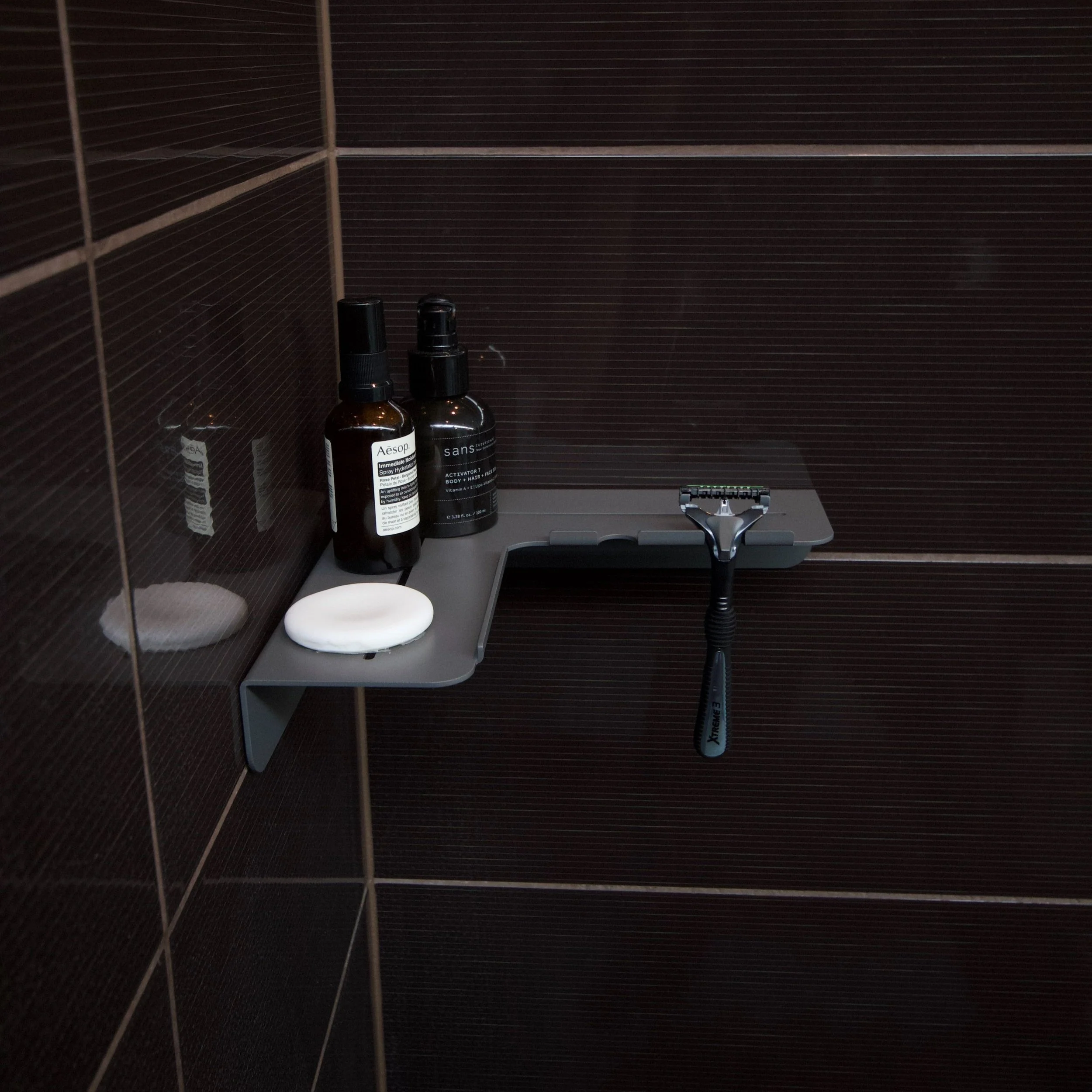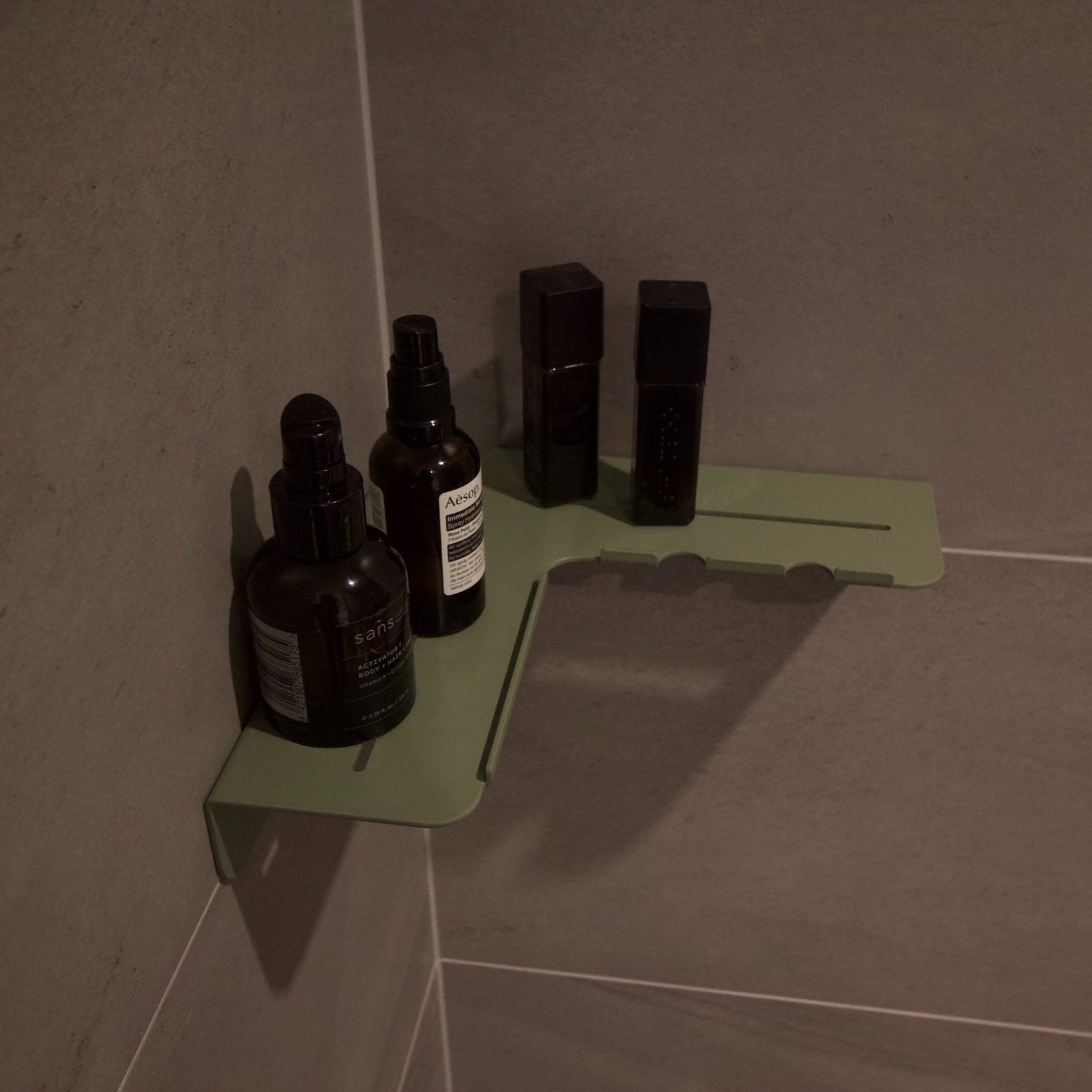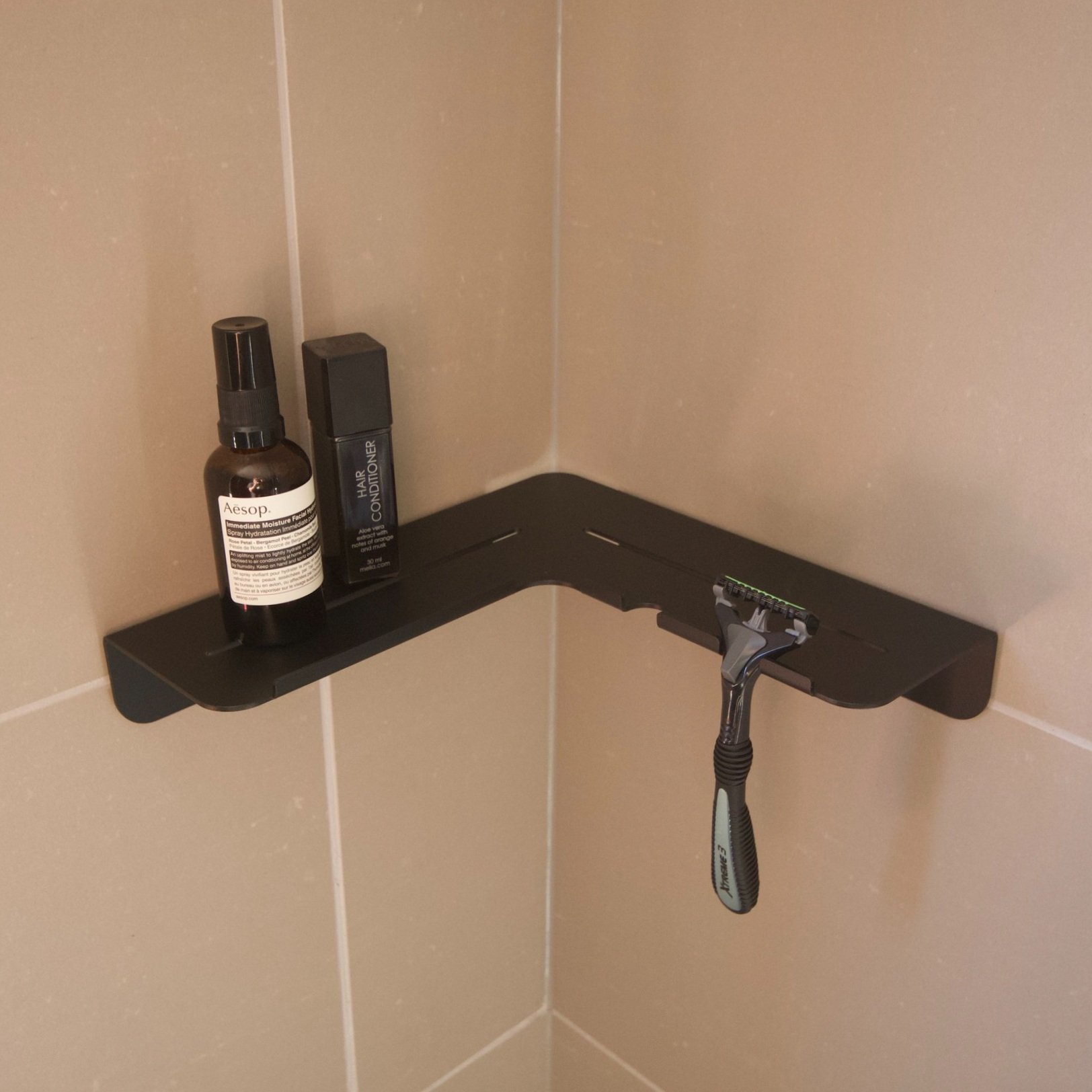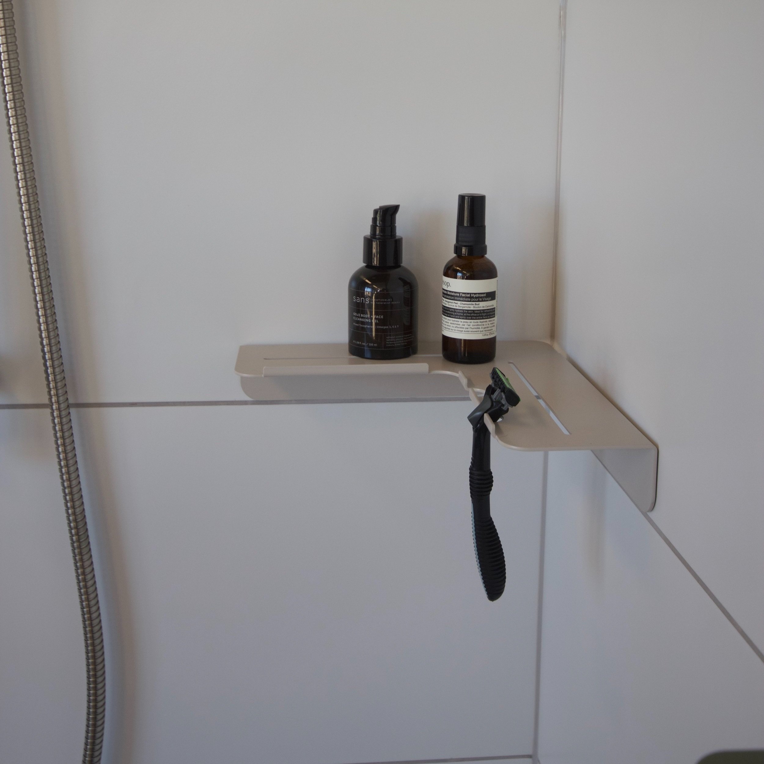 Vito, a minimal folded metal corner shower shelf designed to sit out of the way while still allowing a decent shelf depth. Vito expresses its functionality through its relief pattern drainage holes and two hanging razor holders, which double as loofah or gel bottle hooks.